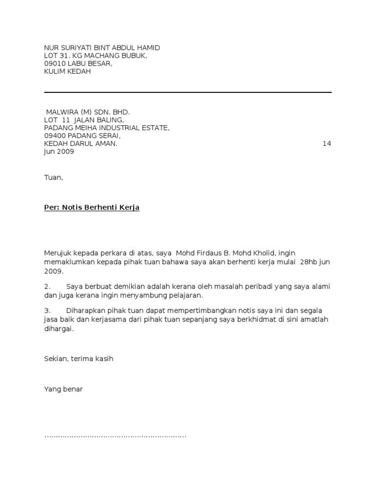 Contoh surat berhenti kerja Atas sebab ikut suami Berikut ialah contoh surat berhenti kerja kerana ingin ikut suami yang bekerja di negeri lain atau ke luar negara. Seperti contoh surat resign diatas cantumkan tanggal kapan tepatnya akan berhenti hal. Oleh itu a perlu memberi notis selama 7 x 4 minggu 28 hari kepada majikannya.